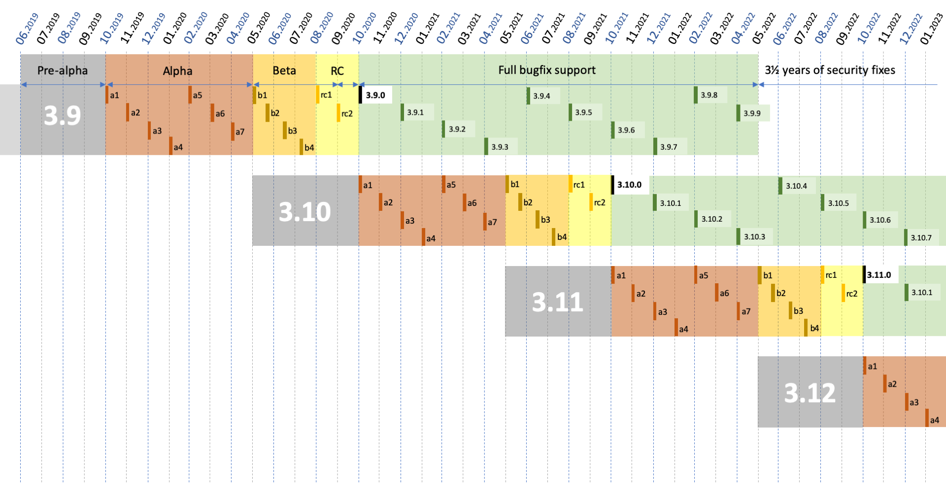 • The first five months overlap with Python 3.(X-1).0’s beta and release candidate stages and are thus unversioned.